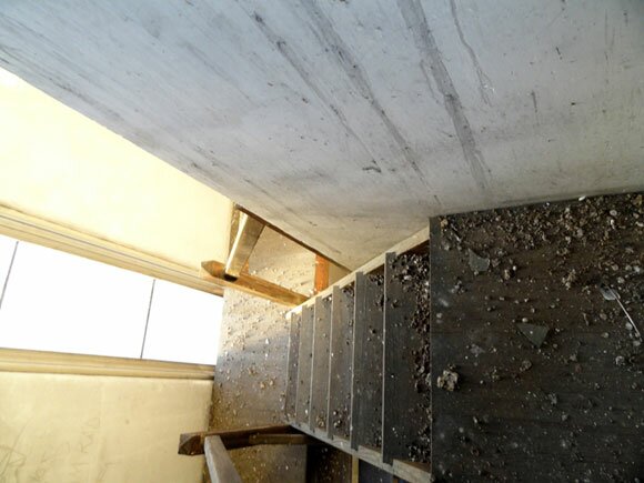 On a narrow flight of steps ascending skyward to the bell tower, the droppings have accumulated in a lining several layers thick.