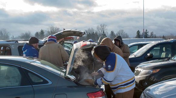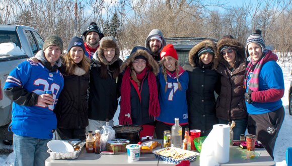 ORCHARD PARK, N.Y. — It’s three hours before kick-off, and the party has begun. Barrel fires are cracking to life. Grills are clicking on. The parking lot at Ralph Wilson Stadium smells like Sunday: hot dogs, sausages, breakfast toasted on thick pans over hot coals, a touch of whiskey to stay warm.